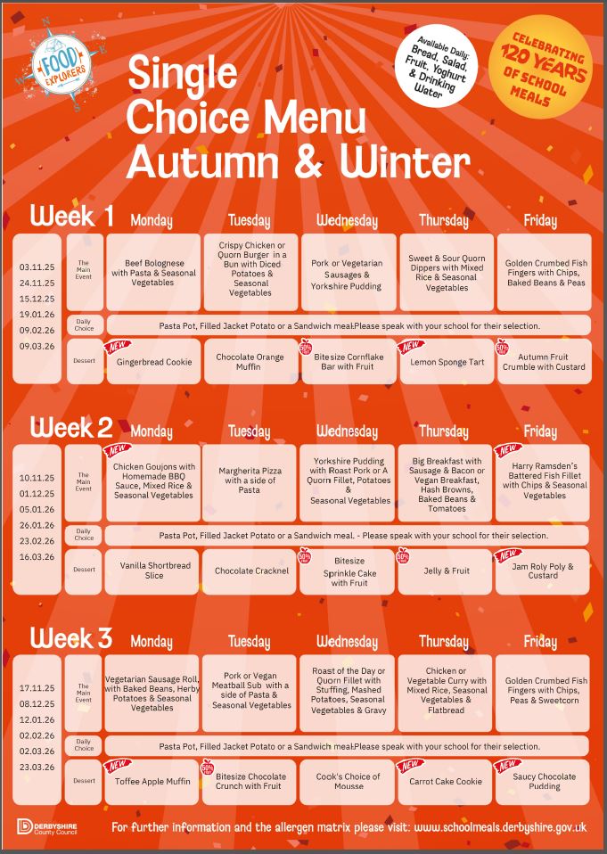 Our school kitchen is run by Derbyshire County Council. They offer a wide range of nutritious meals to cater for dietary requirements.